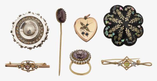 including am amethyst seed pearl ring, two gold stick pins stamped with 9ct a silver mourning brooch, a decorative disc brooch inlayed with gold and mother of pearl and two more.(6)