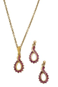 with 9ct hallmarked pair of ruby infinity ear pendants with sixteen mixed cut rubies semi claw set suspended from a pip with post and scroll back together with 9ct hallmarked matching ruby infinity necklace with trace chain and diamond cut loop (2)