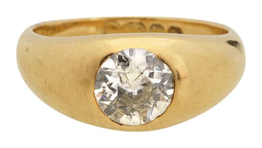 with 18ct London hallmark 1897-8, a single stone diamond measuring 1ct set flush to the curved plain tapering band.