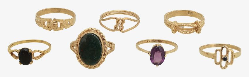 with five 9ct hallmark and two with 9ct stamp, including two knots, an oval blood stone, a link band, an onyx, a sapphire abstract and a purple paste ring (7)