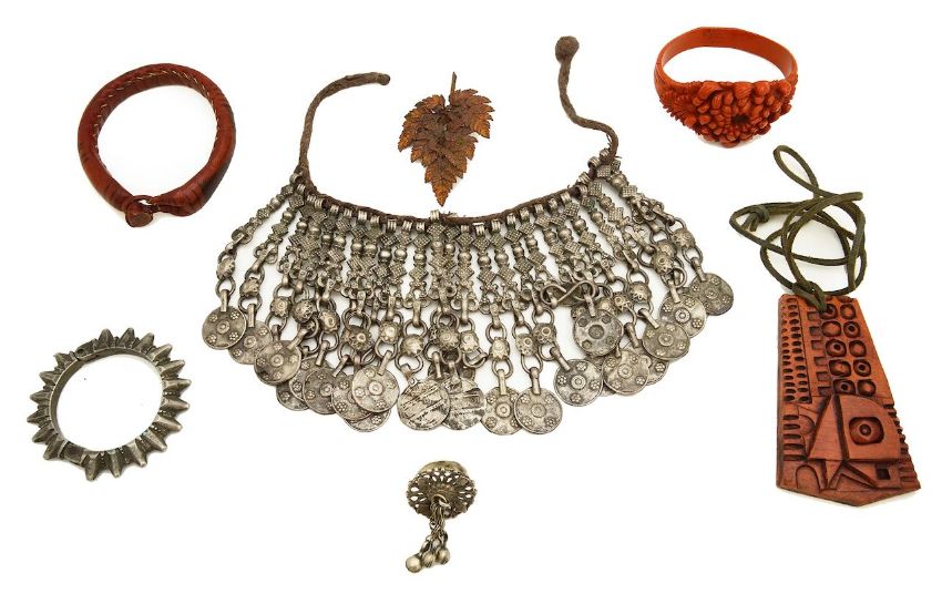 comprising a multi-chain necklace with coin-like pendants, possibly Kutchi, Banjara, or Bedoiun, a spiked kada-style bangle and a sunburst ring with dangling metal beads. Others; unusual pendant attributed to Ron Hitchens (British Sculptor), a bakelite bangle, a leather bangle with nomadic / tribal design and a detailed leaf brooch (7)