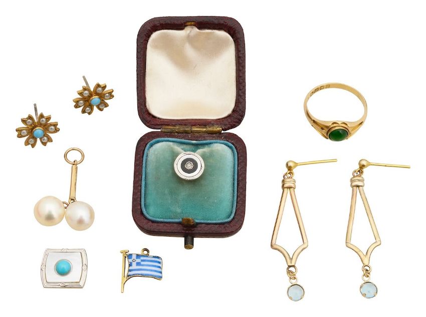 with 1908-9 18ct Birmingham hallmark, centrally bezel set nephrite jade cabochon signet ring, a diamond, onyx and mother of pearl 'target' collar stud with screw back stamped 18ct, a turquoise and mother of pearl rectangle collar stud stamped 750, a pair of aquamarine cabochon ear pendants, a pair of flower seed pearl and turquoise ear studs, two cultured pearls with suspension hoop and a Greek naval flag charm stamped 9ct.(8)