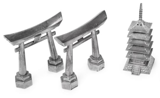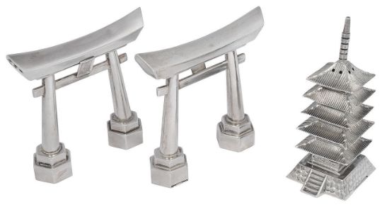 A pair of novelty Japanese .970 silver Tori gate salt and pepper shakers and a .950 pagoda pepperette