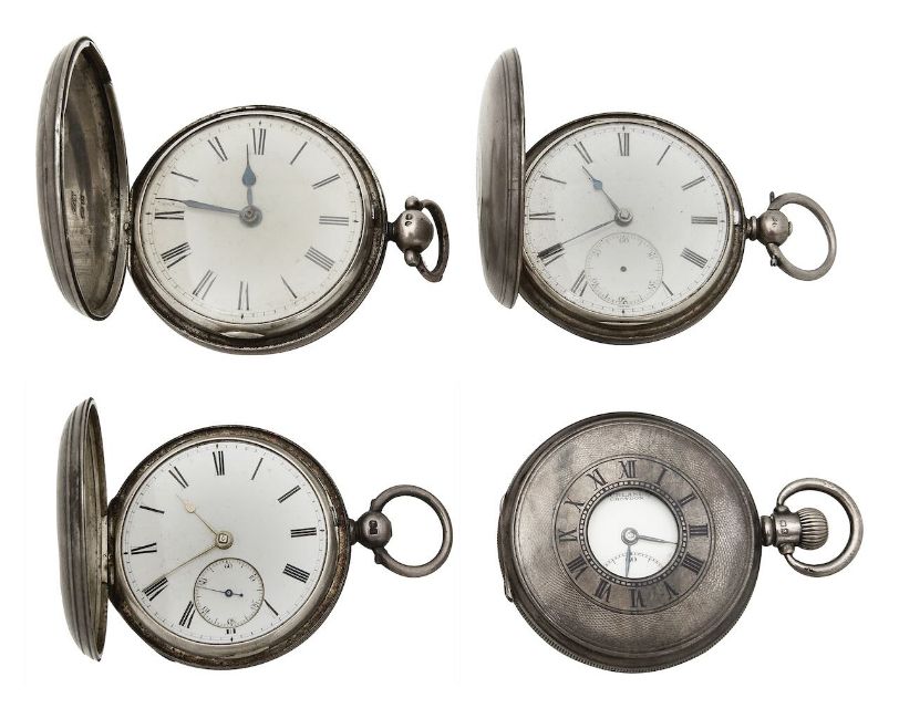 Condition: Movements not guaranteed or tested. All with wear. The half hunter missing hands on subsidiary dial. The half hunter case not closing properly.