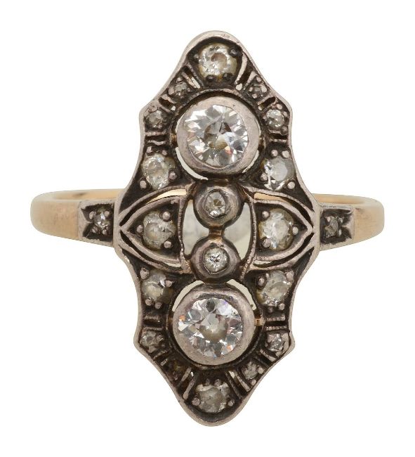 mounted in open work silver, with old cut diamonds bezel set along the finger and grain set diamond surround, indistinct hallmark and plain band