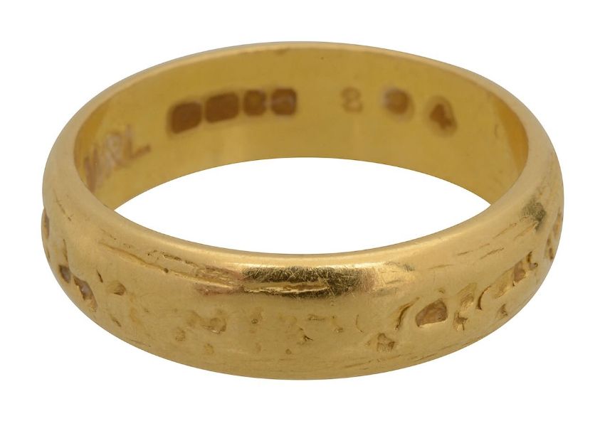 with 22ct hallmark London 1970, abstract detail to band d-shaped profile.