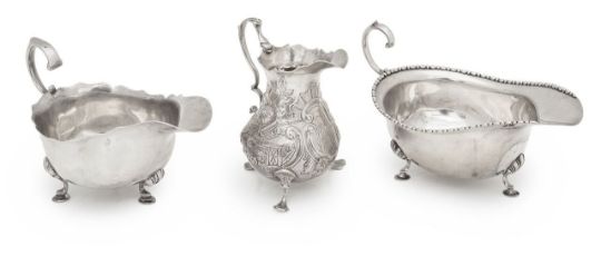 in the George II style, shaped rim, C-scroll handle, three hoof supports; together with a George V silver sauceboat and a Georgian silver cream jug (3)