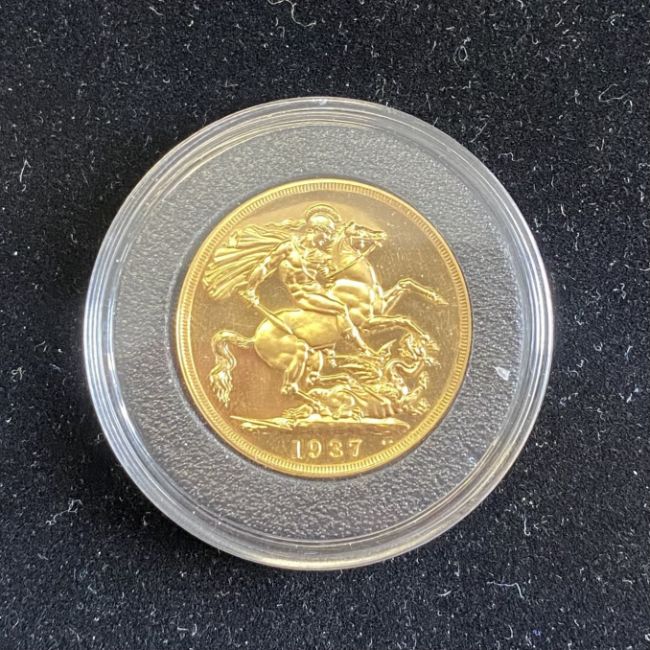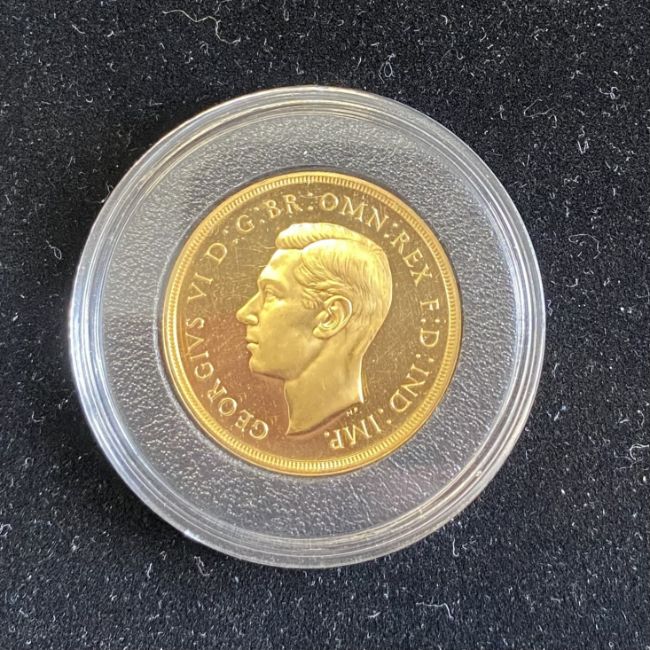 obverse; portrait of King George VI by Humphrey Paget - described as the classical coinage head of the 20th century, reverse; St George slaying the dragon by Benedetto Pistrucci. In capsule and box with certification; The Bradford Exchange.