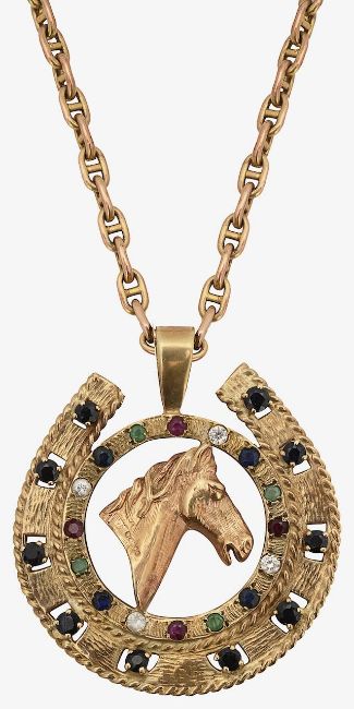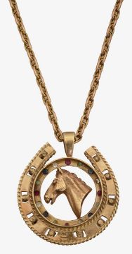 A gem-set 9ct gold horse shoe shaped pendant