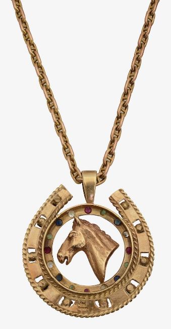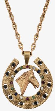 the open work horse shoe pendant with central horse's head realistically modelled, encircled by gem set decoration, on fancy oval link chain stamped 9ct
