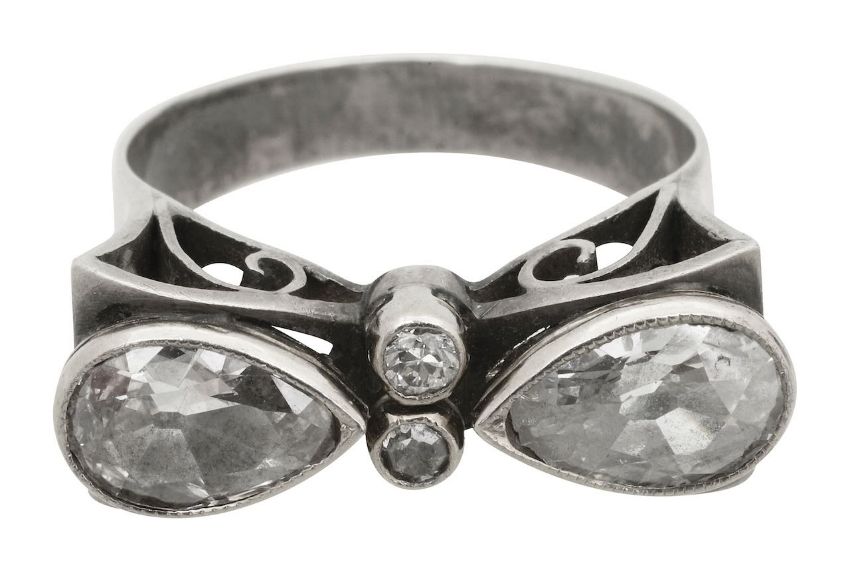 of tied ribbon design, with two old cut diamond drops and two round diamonds with open wire work collet and flat profile band with open work setting