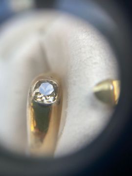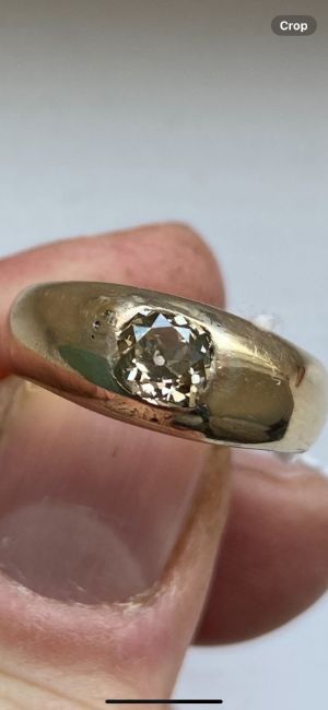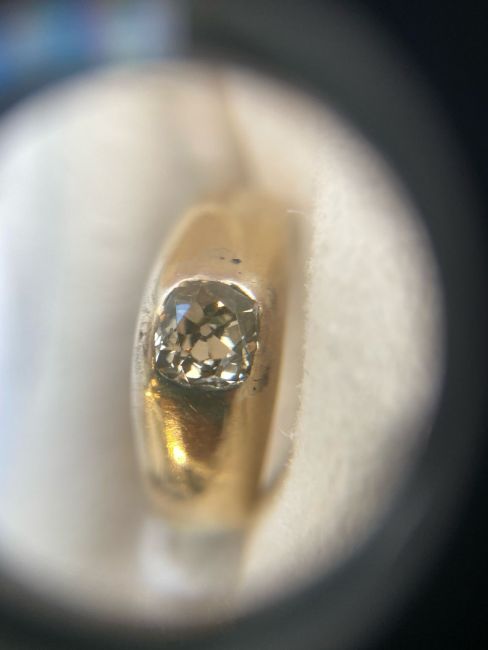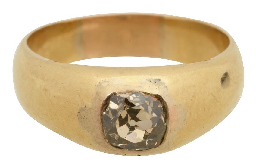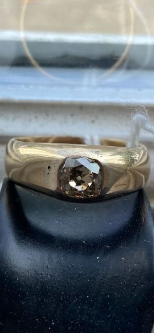 A diamond single stone ring with no visible hallmark, centrally set old mine cushion cut champagne colour diamond, set to a soft curved band. total weight 8 total finger size S-T Condition: With wear commensurate to age, diamond light brown clean and bright, tested as gold, stone size 5x5.5mm