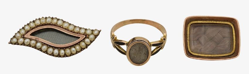 including oval glass compartment ring with foliated black enamel on the shoulder, a seed pearl brooch leaf motif with bezel set compartment and an unusual rectangle brooch with a bezel cut concave glass window with a lattice of hair,(3)