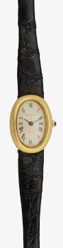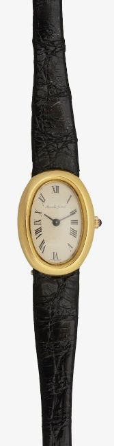 ref YG 7743.1, oval case, with cream dial and Roman numerals, blue cabochon crown, case numbered 83633, case stamped 750
