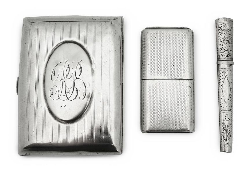 of rectangular machine tooled form, removable lid; together with a George V silver cigarette case, Birmingham, 1913, William Henry Sparrow, or rectangular machine tooled hinged form, monogrammed cartouche; also an early 19th century silver needle case, maker's mark IT, bright-cut decoration (3)