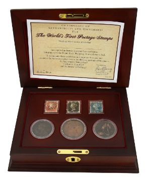 an historic stamp and coin collection, includes a genuine Penny Black, Two Penny Blue and Penny Red. With these are three pennies minted in the Victorian era that feature the different portraits of the Queen: the large copper 'Young Head', the bronze 'Bun Head', and the bronze 'Veiled Head', also accompanied by two black booklets with information on the 'The Penny Black' and 'The World's Second Postage Stamp'. Stamps and coins they are all in capsules and in box with key and certification; Danbury Mint.
