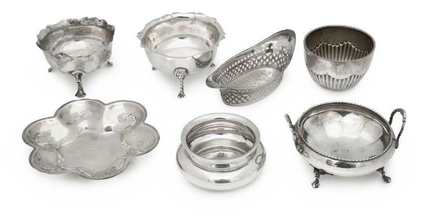 comprising a George V twin-handled example, Sheffield, 1919, maker's mark indistinct, of bulbous cauldron form, raised on four claw supports; together with a George V silver sugar bowl, London, 1911, Russell's Ltd. of jardiniere form with everted rim; with three further silver hallmarked sugar bowls; also a silver lobed pierced dish and a silver navette form pierced dish (7)