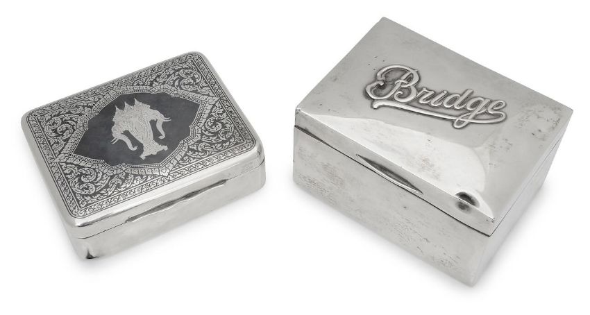 of rectangular form, hinged titled cover, lines interior; together with a Thai Sterling cigarette box, base stamped 'Sterling Thailand Thainakon', of rectangular form, hinged lid with elaborate niello decoration, lined interior (2)