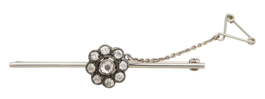 A diamond-set bar broochthe central floral cluster set with nine old brilliant-cut diamonds, with safety chain and detachable from the plain bar broochflowerhead diameter 1.3cm, brooch length 5.7cm, combined 6.9gCondition: Flowerhead probably 19th century.Later bar brooch