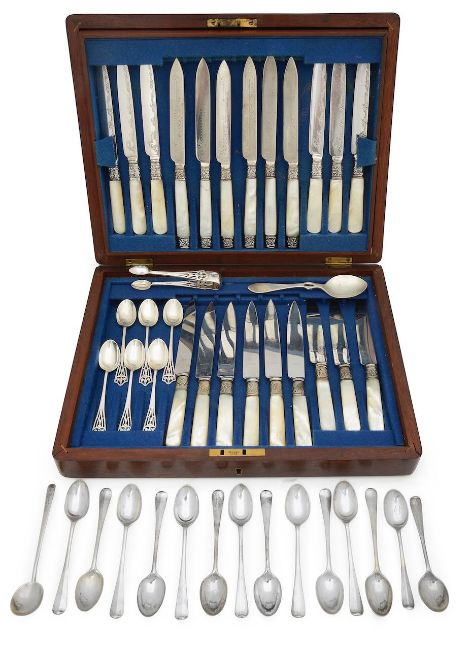comprising a George VI set of twelve silver Hanoverian pattern teaspoons, London, 1938, Francis Higgins III; with two similar; an Edward VII set of six silver coffee spoons with pierced handles, London, 1908, Charles Clement Pilling; with three other items of silver; also a set of six mother-of-pearl handled fruit knives, etched steel blades; together with a similar part set of fifteen fruit knives, both contained within associated mahogany canteen (qty)