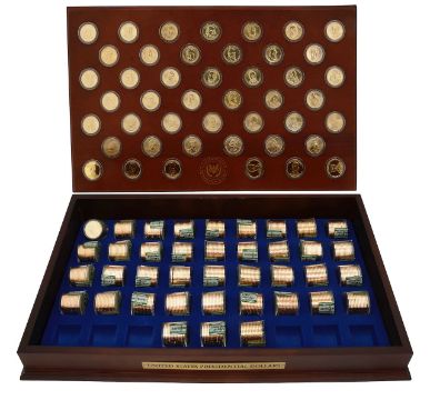 issued by Danbury Mint, official U.S. Mint issues only exist up to Ronald Reagan (40th), there are 39 official portraits (Jimmy Carter was still alive when issued), with each official portrait there are the accompanying 39 rolls of 12 coins. This set also includes privately minted tribute portraits, these are found alongside the other official 39 portraits, nonofficial; portraits for Jimmy Carter, George H.W. Bush, Bill Clinton, George W. Bush, Barack Obama, and Donald Trump.
