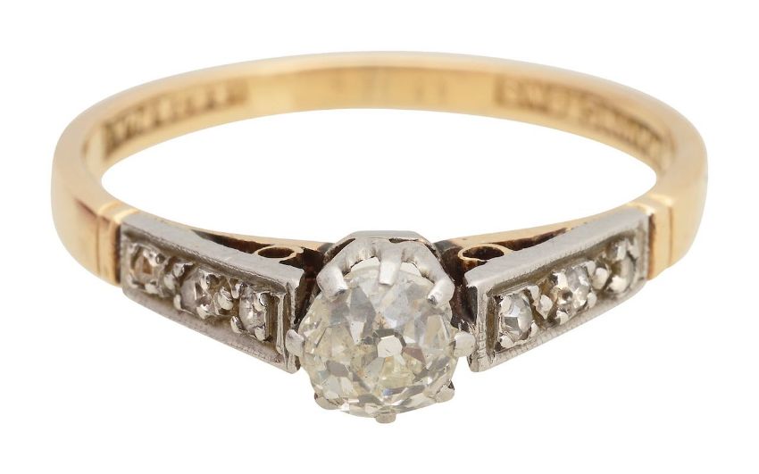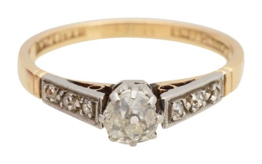 with 18ct & plat stamped to inside, a single stone old cut diamond and four single cut diamond set to shoulders with Bravingtons stamped to inside.