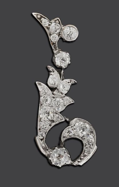 featuring twenty old mine cut diamonds grain set to an organic floral motif with suspension loop.