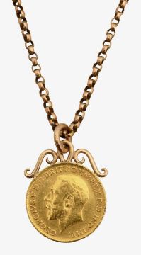 with St George slaying the dragon and George V facing left, fixed to a scroll mount with suspension loop and 9ct stamp to belcher chain.
