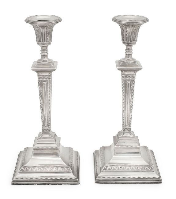 A pair of late Edward VII silver candlesticksSheffield, 1910, Richard Martin & Ebenezer Hallin the Adam style, detachable beaded drip trays on inverted bell sconces, tapered square columns with reeded panels within zig-zag borders, stepped plinth bases, weighted (2)height 29cmCondition: Good condition, minor dings, original matching marked sconces.