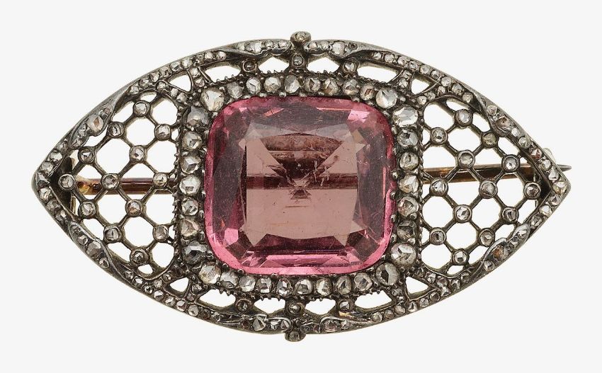 of openwork lattice navette design, centrally-set with a shaped rectangular pink spinel with the rose-cut diamond-set border to the diamond-set lattice frame with lapped edges (three tiny diamonds deficient)