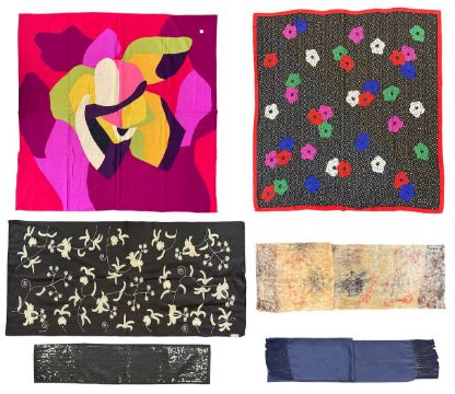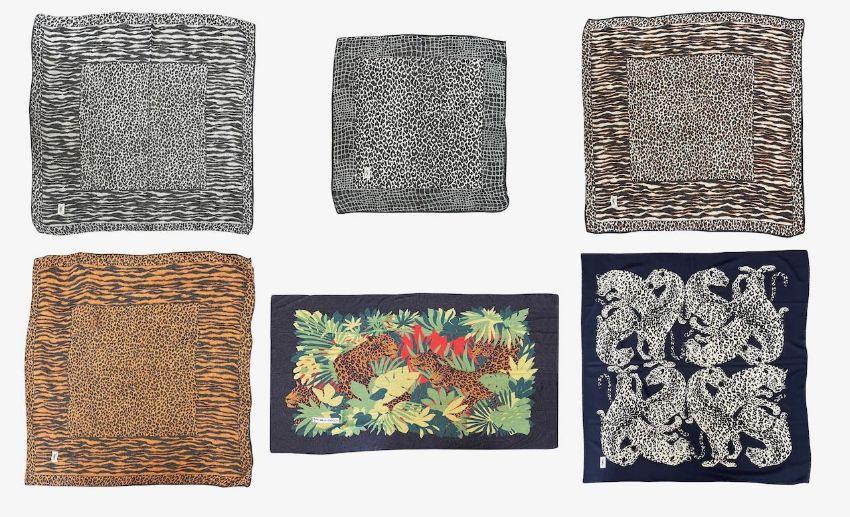 A varied collection of Yves St Laurent scarves and othersto include three identical leopard and zebra print silk scarves of differing colour profiles, one silk scarf of leopard and giraffe design, one silk scarf displaying three leopards among fauna, one silk/wool blend scarf displaying twelve intertwined cheetahs, one silk scarf displaying a repeated floral design, all branded YSL. Together with five other unbranded textiles (12)Three silk:130cm x 130cmLeopard/giraffe silk: 85cm x 85cm Three leopards silk: 210cm x 130cm Twelve cheetahs: 130cm x 130cmFloral:130cm x 130cmCondition: All in good condition with some minor snags and stains.