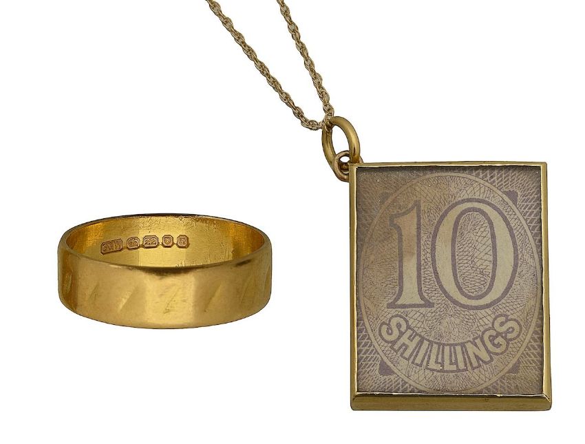 A 22ct band 1968, a 10 shilling box charm and chain,