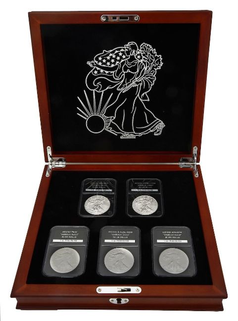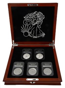 comprising five 1oz USA fine silver dollars with different uncirculated and proof finishes, the coins are in perspex slabs and mint state (PCS stamps and coins) in a wooden box with documentation