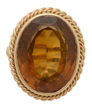 with 9ct hallmark, an oval bezel set citrine with a double rope border on a decorative mount.
