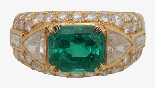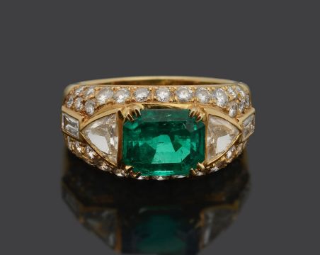 Condition: Overall condition good/very good. Little sign of wear. Emerald: 9.1 x 7.7 x 6.2mm, strong vibrant green with relatively few inclusions (a few near one claw) Diamonds: trilliants each spreading 0.40-0.50cts approx., K/L, VS2/SI1; others bright with good clarity and colour