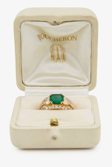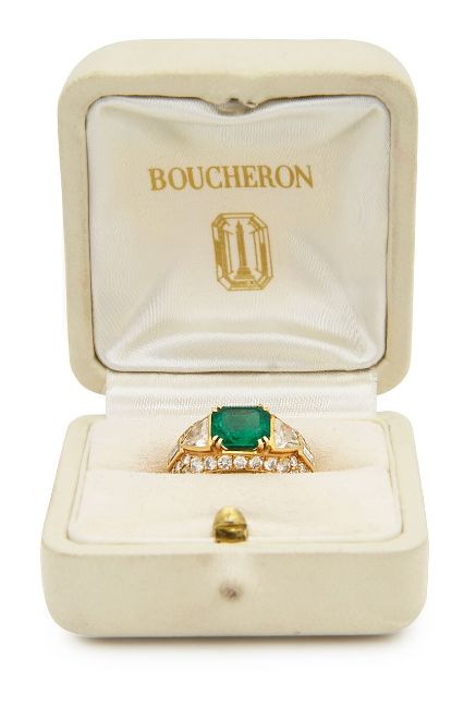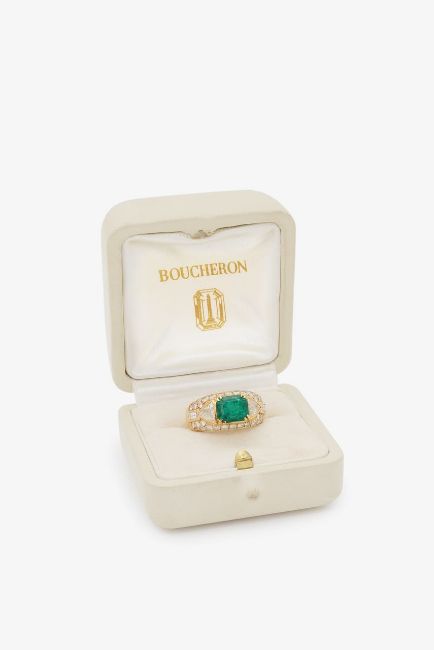 centrally-set with a rectangular cut-cornered emerald weighing approx. 3.10cts, claw-set to either side with a triangular-cut and baguette-cut diamond collets above the pavé-set diamond surround, signed 'Boucheron', stamped '750' and with a French poinçon, contemporary maker's fitted cream case
