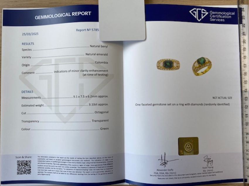 With a GCS report, numbered 5785-1781, dated 25 March 2025 stating that the emerald is Colombian with indications of minor clarity enhancement