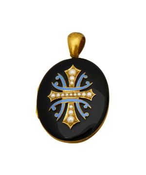 the oval black enamelled locket with applied seed pearls in the form of a cross and blue enamelled initials, the reverse with memorial inscription opening up to reveal hair