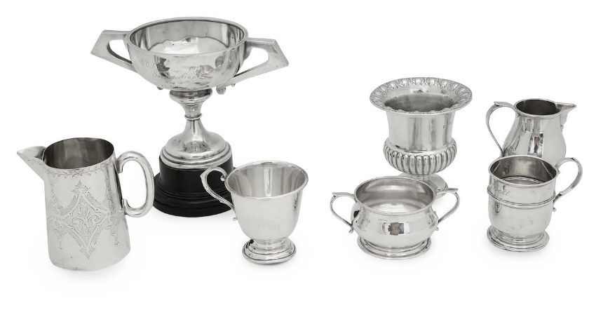 comprising an Edward VII silver campana form urn, London, 1906, Edward Barnard & Sons Ltd. bearing inscription; together with a George V silver twin-handled trophy, Birmingham, 1913, Wilmot Manufacturing Co. angular handles, bearing inscription, with ebonised pedestal; also a Victorian silver milk jug, Sheffield, 1877, John Round & Son Ltd. bright cut foliate decoration; a George V silver sparrowbeak cream jug, London, 1918, on pedestal base; together with two silver Christening tankards and a twin-handled silver sucrier, various dates and makers (7)