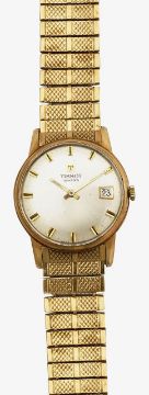the silvered dial with raised baton numerals and calendar aperture, on a 9ct gold watch head with a 9ct bracelet link marked on the clasp 375