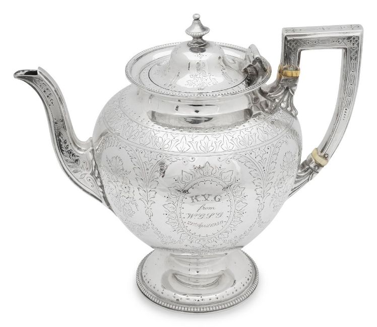 A Victorian silver coffee potLondon, 1876, Thomas Whiteof bulbous ovoid form, hinged cover with finial, angular handle with ivory insulators, heavily chased decoration with later inscription, pedestal baseheight 19cm, total weight approx. 23.78oztCondition: IMPORTANT NOTEThis item has been registered as exempt from the UK Ivory Act 2018. Ivory declaration submission number reference: 1GHD5TE6