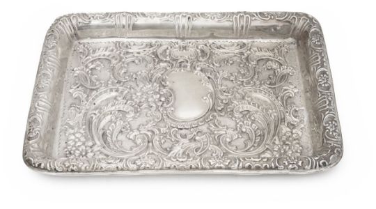 of rectangular form, shaped rim and high sides, all-over repoussé foliate scrollwork decoration, blank cartouche