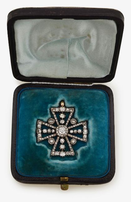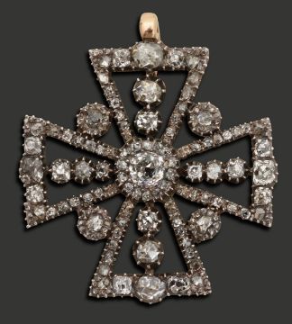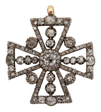 of patée formée design, set throughout with old brilliant-cut and old-cut diamonds, later suspensory loop, mounted in silver and closed back yellow gold setting (possibly renewed), fitted case