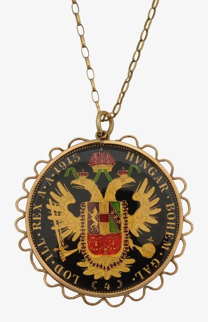 held in a loose fitting coin mount with fluted border and suspension hoop to belcher chain.