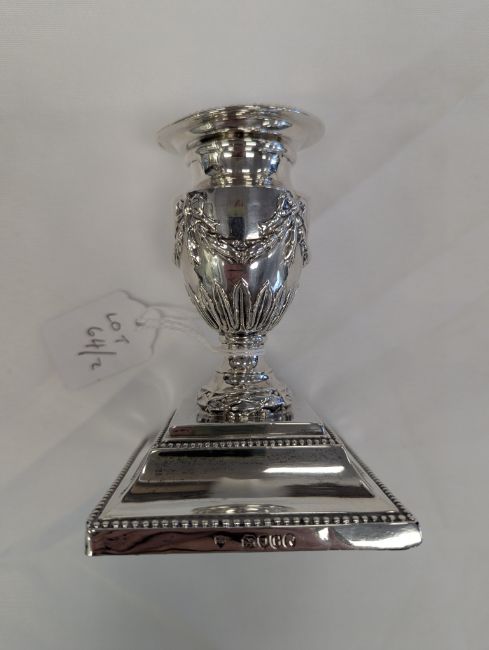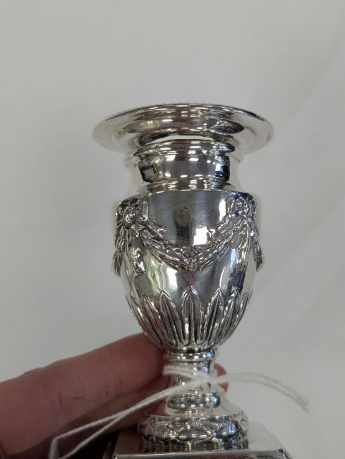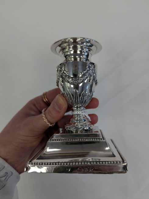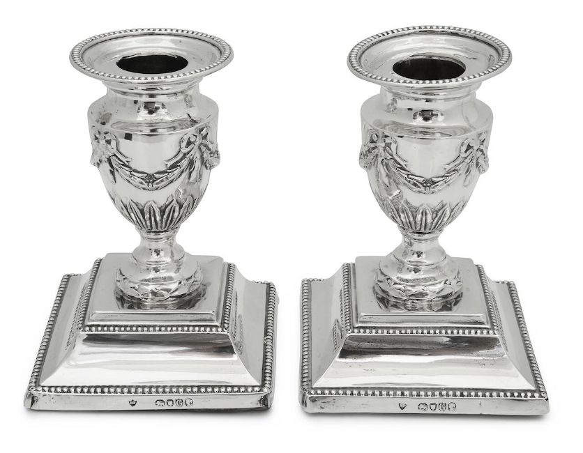 A pair of Victorian silver Adam style dwarf candlesticks