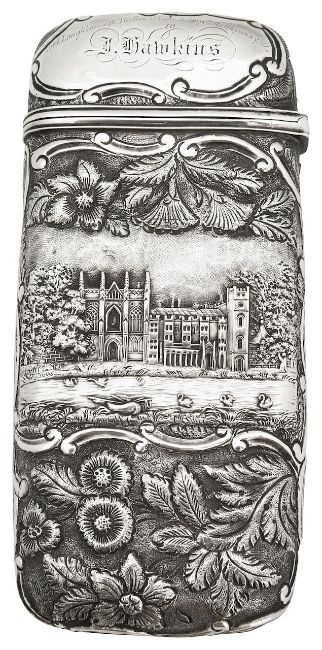 decorated with double-sided chased and repoussé 'castle top' scenes of Newstead Abbey and Abbotsford, within elaborate foliate scroll ground, bearing inscribed cartouche "Lord Loughborough...to J. Hawkins"