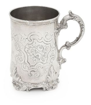 heavily chased body with named crest and motto 'Semper Vigilans', foliate scroll handle with acanthus thumbpiece, further relief foliate scroll apron and four feet