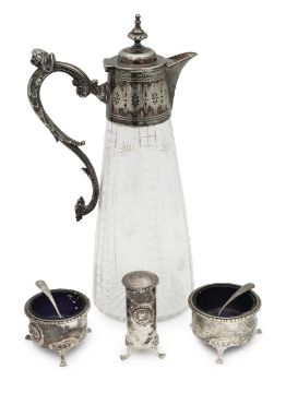 comprising a pair of salts, blue glass liners and matching spoons, with a pepperette, of cylindrical form, beaded rims, each raised on three claw supports surmounted by coronets in relief; also a Mappin & Webb Prince's Plate and cut glass claret jug (6)