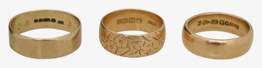 Two 18ct gold wedding bands and a 9ct band
