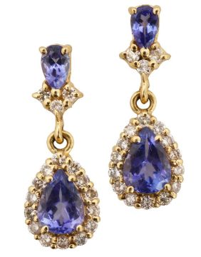 featuring a pear shape tanzanite with a brilliant cut diamond halo suspended from a second smaller pear shape tanzanite above three diamonds with 14ct stamp to peg and scroll fixings.